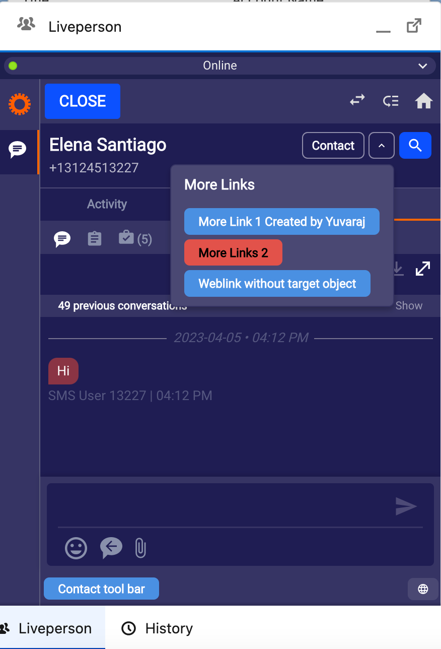 - Toolbar: Displays in the lower-left corner of the UI. The links only display during interactions, such as Conversations, and phone/email attributes for use as parameters in the configured URL.