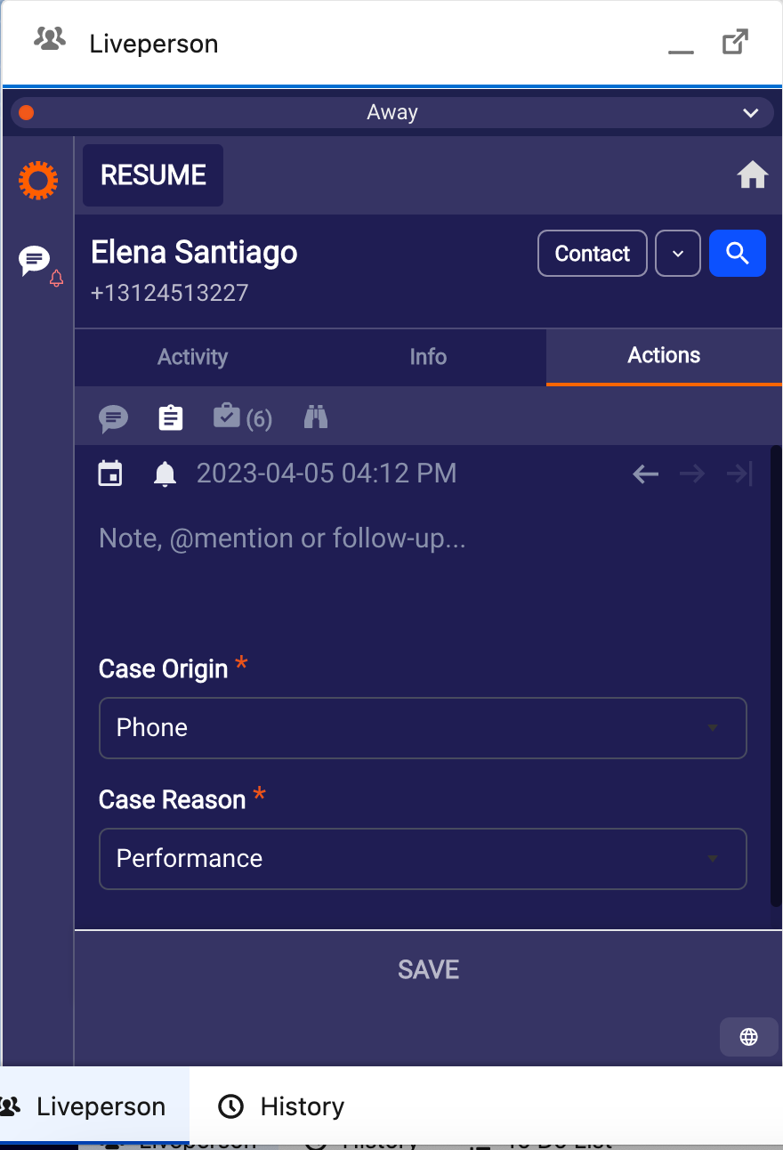 - Consumer Info Tab: This tab automatically displays important information about the consumer who is messaging you. This will be a customized view of contact/account/lead fields from Salesforce and will include information from LivePerson such as the source channel of the conversation or any custom variables collected by your contact center.
