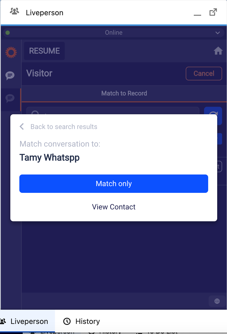 If the CRM does not locate a matching record, you can create a new one as a lead, contact or account. You will only be able to match the record but not save it to the CRM if the consumer information such as name, phone or email are unknown. This will at least allow all the conversation context to be stored in the CRM for the matched customer.