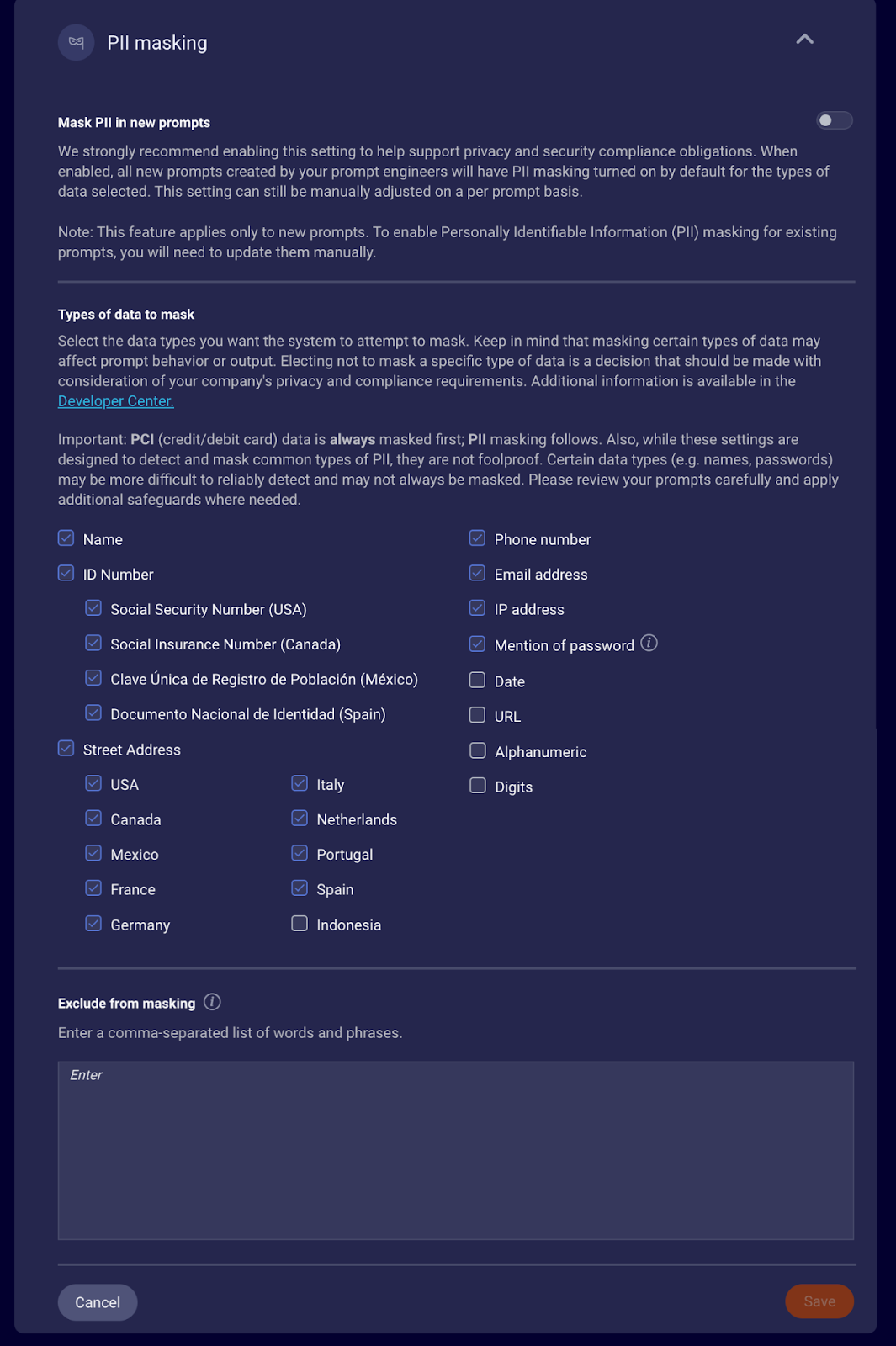 - Default masking option: Organizations can set PII masking to be on by default for new prompts, promoting best practices.