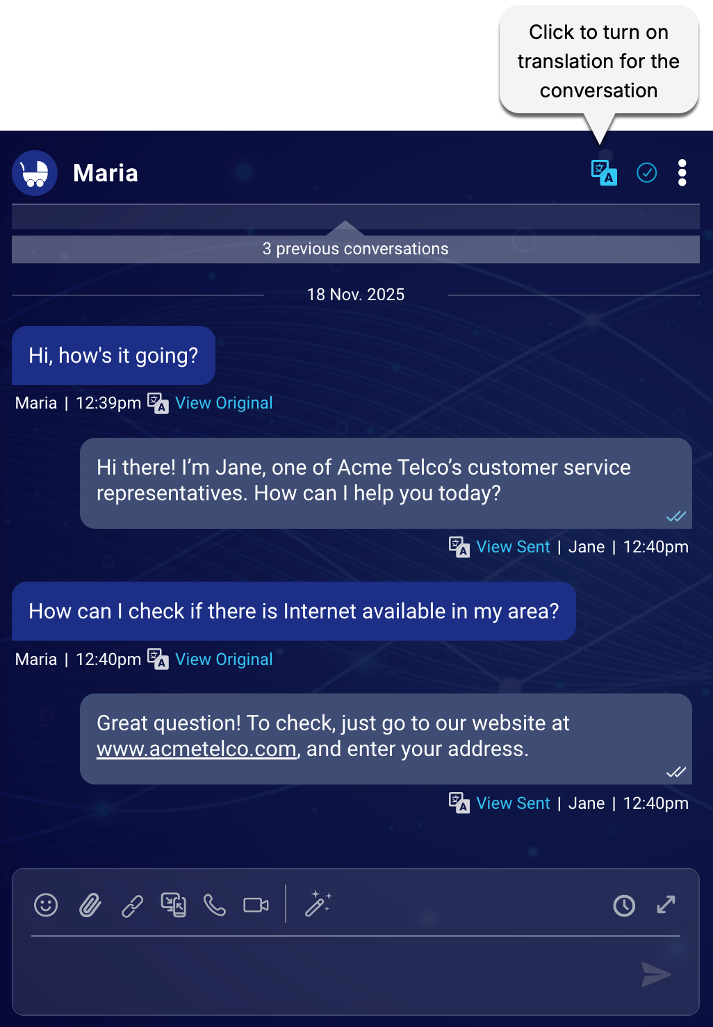 A note on editing: To enable this leap in usability and speed, we've removed the ability to edit the translated message before it goes to the consumer. This trade-off delivers a much more fluid and efficient agent experience.